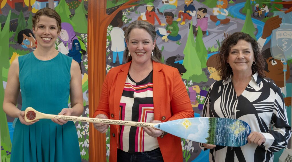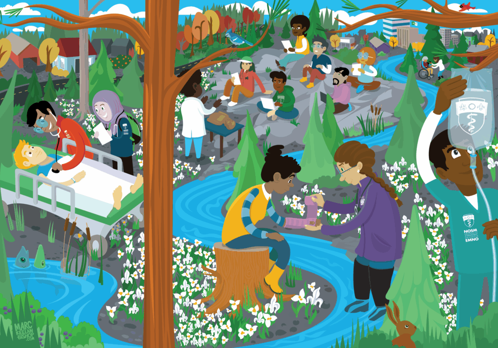 Cette murale reflète l’Université EMNO/NOSM, un campus décentralisé à l’échelle du Nord. Elle souligne une formation médicale ancrée dans les communautés rurales, urbaines, francophones et autochtones.